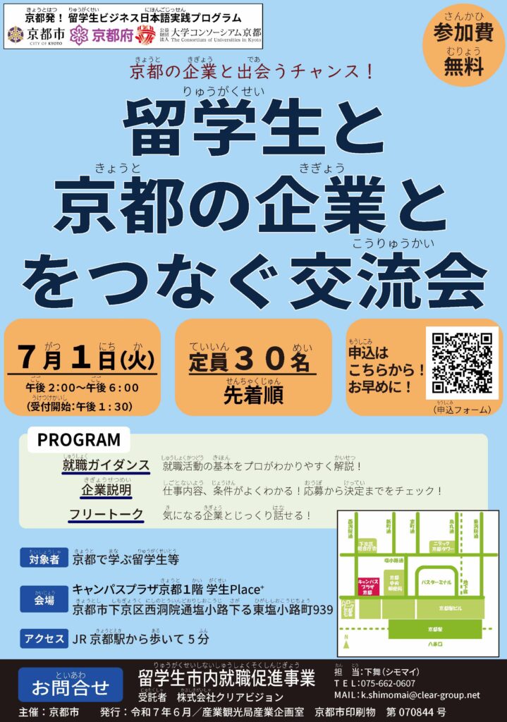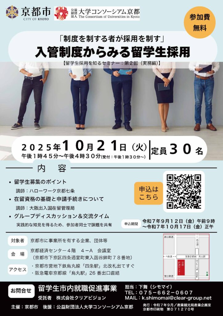 イベント 留学生採用を知るセミナー 2025年10月5日 しがジョブフェア2025夏 2025年8月6日 留学生と京都の企業とをつなぐ交流会 2025年7月1日 『和歌山の優良企業が京都に集結!! 自分に合った企業を見つけるチャンス。 積極採用中の企業が皆様をお待ちしております。』 2024年2月3日 学生と京都の企業とをつなぐ 学内合同企業説明会in京都外国語大学 2023年8月28日 京都の学生等と京都の中小企業とをつなぐ合同企業説明会 2023年8月28日 外国人留学生向け就職活動サポートセミナー 2023年8月28日